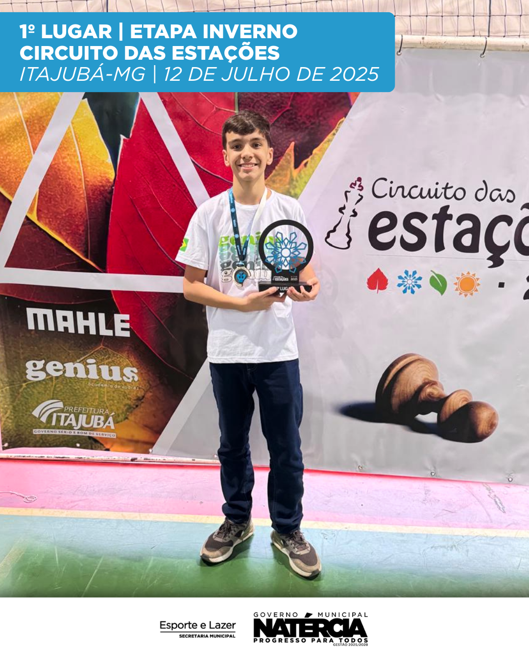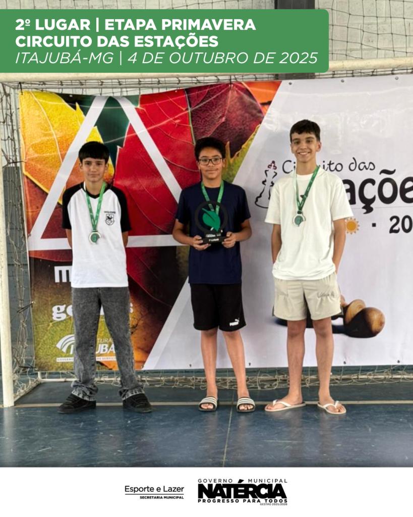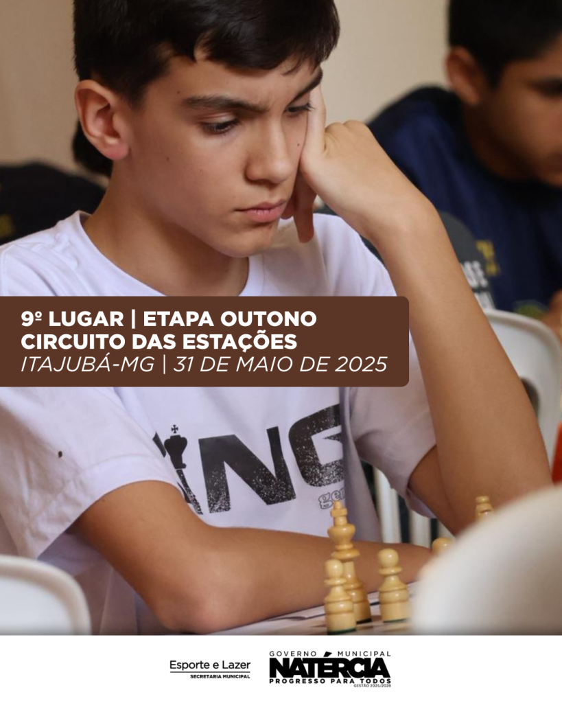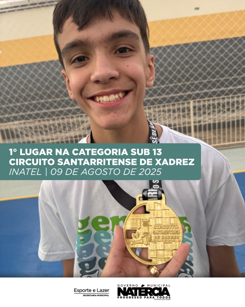 O atleta Tomás Lopes, de Natércia, conquistou o 1º lugar na categoria Sub-13 no Circuito Santarritense de Xadrez, realizado no Inatel – Santa Rita do Sapucaí-MG, no dia 09 de agosto de 2025.