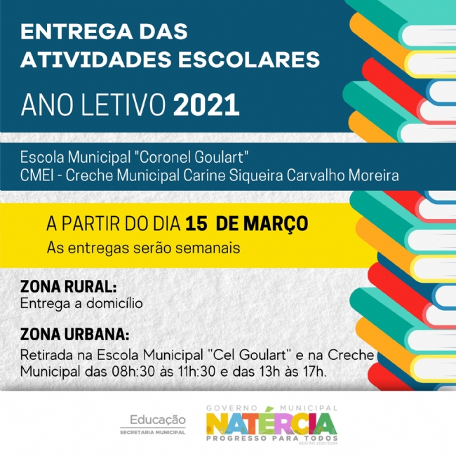 As atividades serão entregues na zona rural e na zona urbana poderão ser retiradas na Escola Municipal “Cel Goulart” e na Creche Municipal das 08:30 às 11:30 e das 13h às 17h.