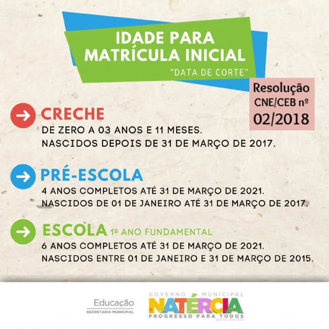 Entre as informações importantes está a “data de corte”, que define que as matrículas de crianças, tanto na Educação Infantil quanto no Ensino Fundamental, serão realizadas considerando a data de corte de 31 de março, estabelecida nas Diretrizes Curriculares Nacionais e reafirmada na Resolução CNE/CEB nº 02/2018.
