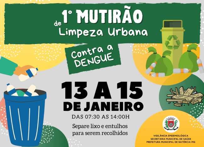 A Vigilância Epidemiológica por meio da Secretaria de Saúde realizará nos dias 13, 14 e 15 de Janeiro de 2021, o 1º Mutirão de Limpeza Urbana.