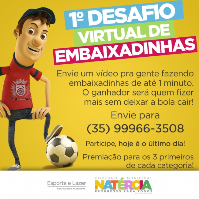 Hoje é o último dia para enviar os vídeos do 1º Desafio Virtual de Embaixadinhas! Bora participar?