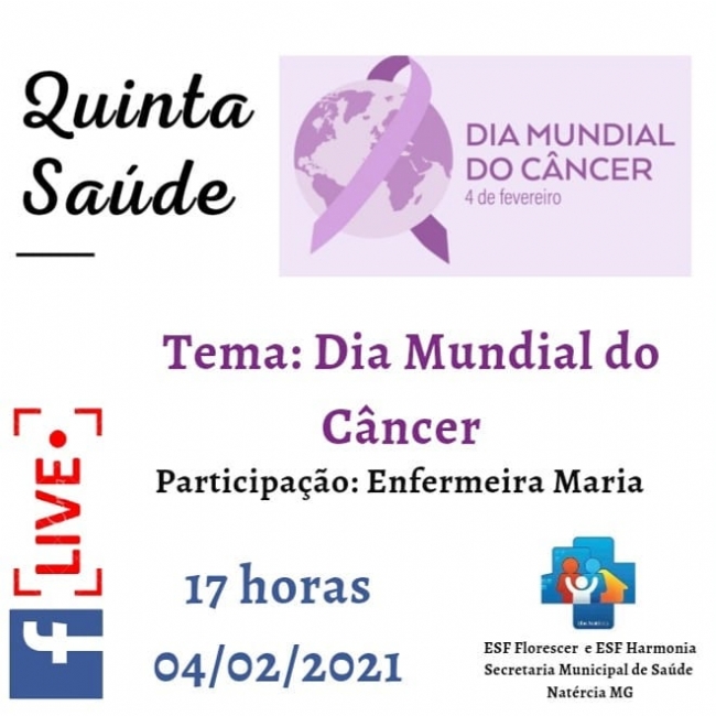 Notícias Quinta Saúde 3 de fevereiro de 2021 0 Compartilhar no Facebook Tweet no Twitter Acompanhe amanhã na Quinta Saúde o tema: Dia Mundial do Câncer a partir das 17h na página da Prefeitura de Natércia no Facebook.